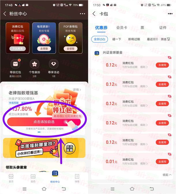 小编提示:打开“支付宝”APP搜索【兴证全球基金财富号】进去,点底部【粉丝中心】进去,点【收起】再左右滑动添加自选可以领到6个0.12元支付宝通用消费红包,秒到支付宝卡包里,可以在支付宝APP付款的时候抵扣使用