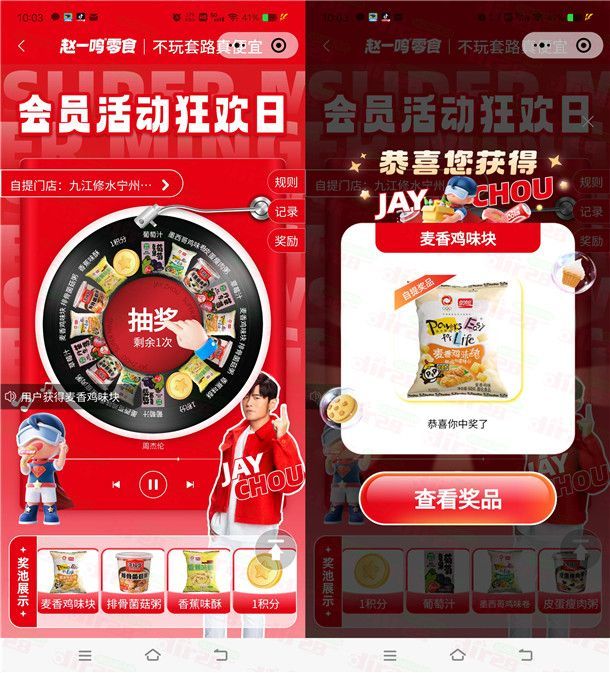 昨天是零食很忙的1积分抽零食饮料的活动,今天是赵一鸣的活动,参加方式都一样都可以去参加,通过打开微信进去小程序活动里,进去用1积分可以兑换1次抽奖机会,邀请好友添加店长微信还可以再抽1次,中到的零食可以去自己线下赵一鸣门店免费领取,有积分的去(只要在赵一鸣注册过会员买过任意一次东西都会有积分)。