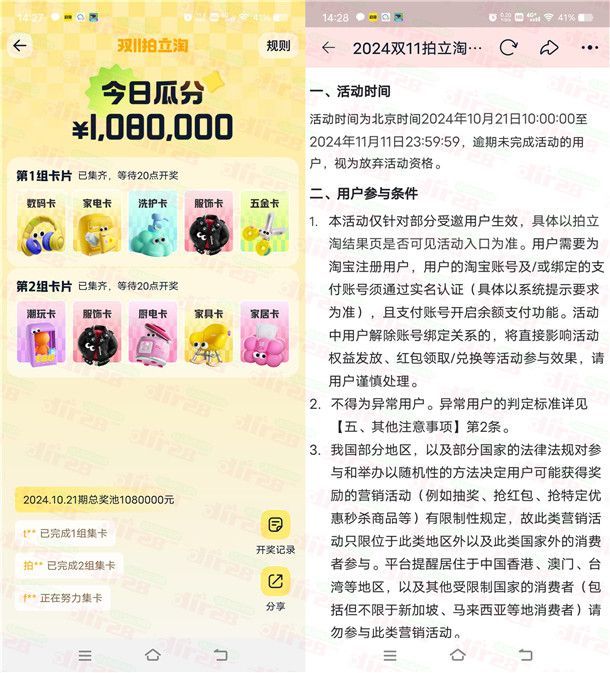小编提示:打开淘宝APP搜索【拍拍乐】进去,每天可以集齐2套卡片,每天晚上20点开奖,根据猜中的卡片瓜分百万淘宝无门槛红包