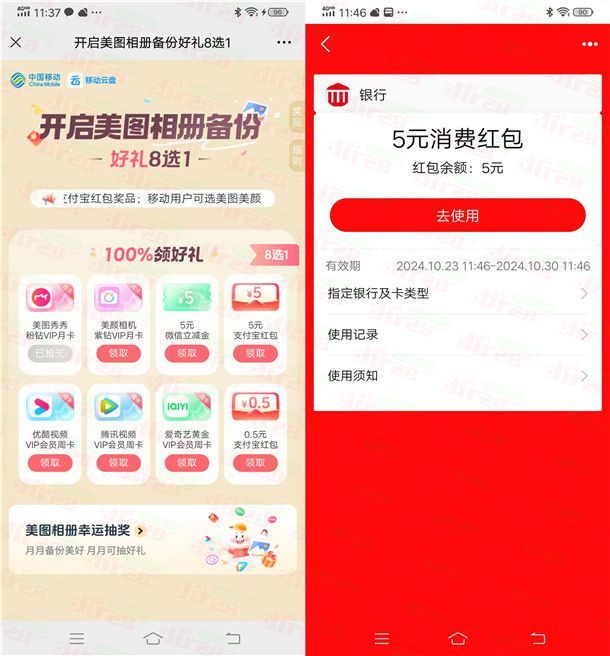 这是中国移动云盘联合美图秀秀举办的一个好礼8选1的活动,前段时间也有过一次类似的活动,如果之前参加过的这次就参加不了,全国三网手机号码都可以去,通过打开微信进去活动里,跳转到美图秀秀登录移动云盘授权,并开启相册备份就可以领取0.5-5元支付宝红包、微信立减金,数量限量。