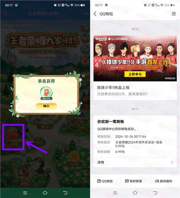 参加王者荣耀手游举办的9周年红包雨抽最高999.99元现金红包活动,通过打开手机QQ进去活动里,进去点击左侧【红包雨】图标抽奖,需要登录一次游戏才可以抽,有机会中到0.99-999.99元现金红包,小编测试中到0.99元,秒到QQ钱包余额里,非必中。