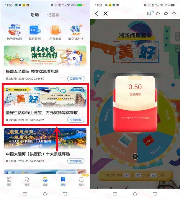 参加潮新闻举办的美好生活季线上寻宝瓜分万元奖励活动,通过打开潮新闻APP进去活动里,根据活动引导找到8张海报卡片就可以进去抽奖(小编也在下面列举了每张卡片的位置),有机会中到0.5-2元现金红包、50元电影券,小编测试中到0.5元现金红包,可以直接提现到支付宝秒到,非必中。
