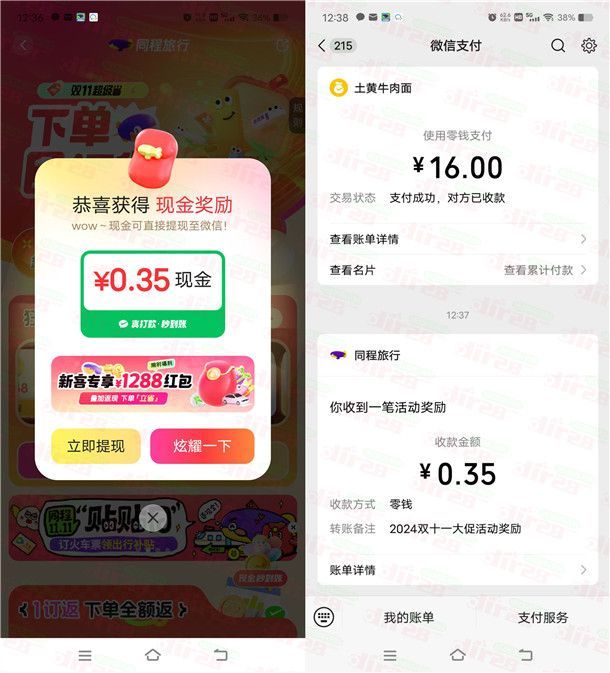 同程旅行双11抽随机微信红包 亲测中0.35元秒推 每天可抽
