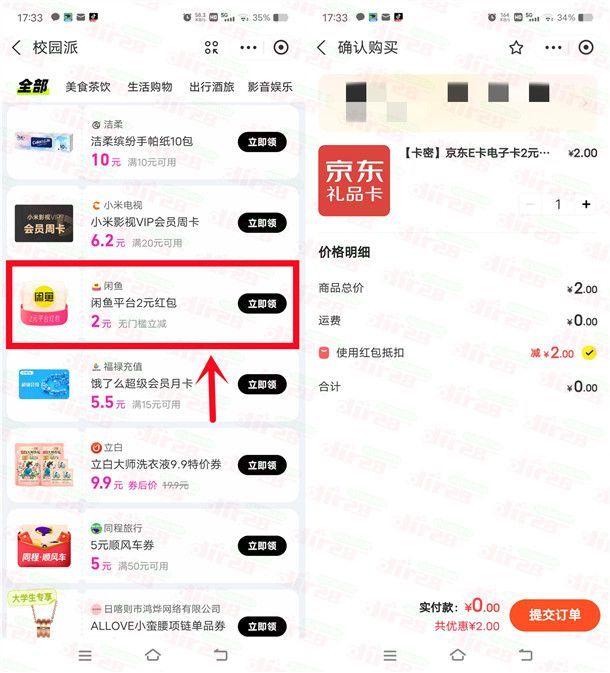 支付宝校园派直接领2元闲鱼无门槛红包 可0元撸2元京东卡