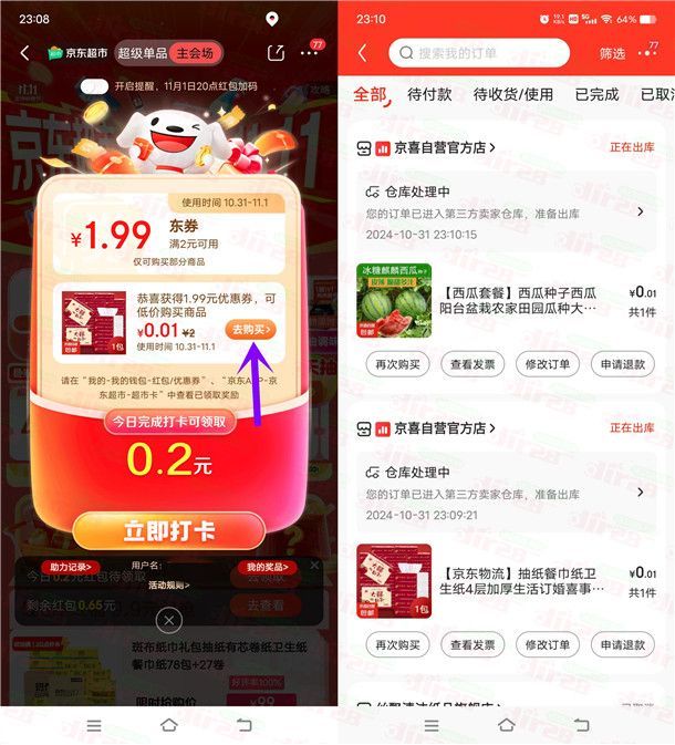 京东简单0.01元撸多个实物包邮 每天还会必中无门槛红包