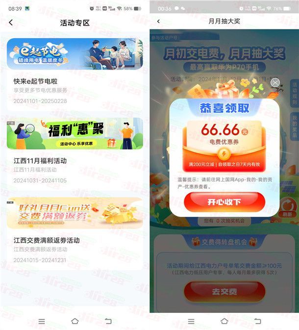 小编提示:打开网上国网APP首页点精选活动右侧的更多进去,里面几个活动都点进去看看,如果有抽电费券的活动就可以参加,小编江西的活动是交100元电费抽最高66.66元电费券,我交了2充100元电费中了一个16.66元电费券和一个66.66元电费券