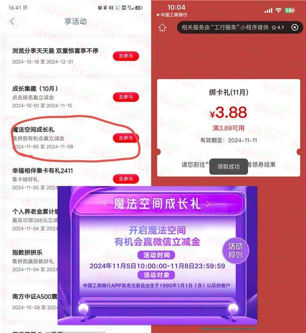 工行魔法空间成长礼活动抽1-3.88元微信立减金 亲测中3.88元