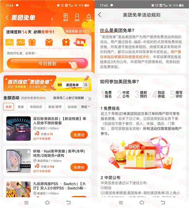 小编提示:打开“美团”APP搜索【美团免单】进去,部分地区才可以参加(如果搜索没有活动入口就说明你当前地区不参加活动,美团APP首页左上角修改地址再去搜也可以进去活动里),连续签到14天可以得到1张免单卡,可以兑换所有团购套餐使用