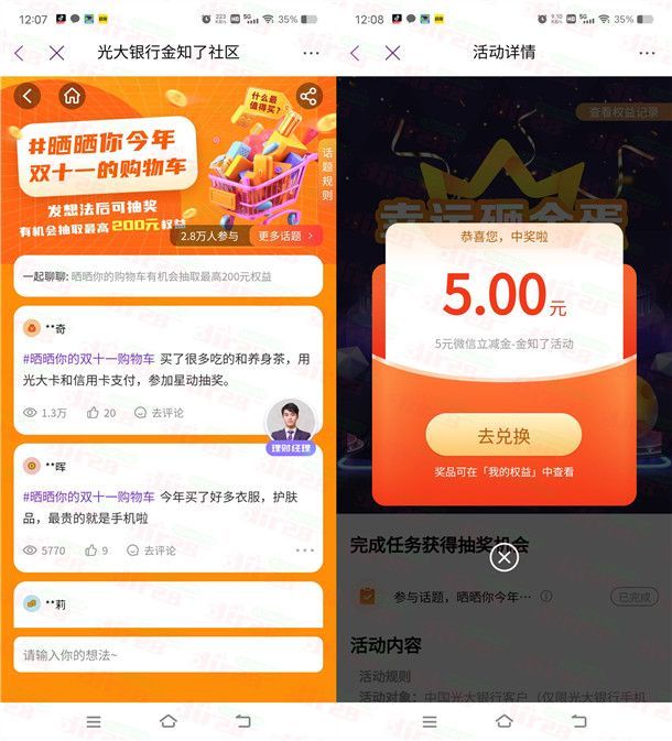 参加光大银行举办的金知了社区晒晒你的今年双十一购物车抽最高200元微信立减金活动,注册过光大银行二类电子卡的也可以去,通过打开光大银行APP进去活动里,点底部输入框随便写十几个字提交后可以进去抽奖,有机会中到3-200元微信立减金,小编测试中到5元,如果中到微信立减金领取失败就晚点再去领,非必中。