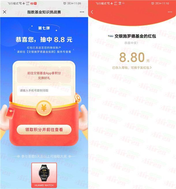 参加交银施罗德基金举办的指数答题挑战赛抽10万个红包活动,通过打开微信进去活动里,活动持续7天,参与越多,机会越多。活动期间答题满5天还可获价值2400元的华为智能手表抽奖资格(仅限交银基金APP客户),进去答完1道题就可以抽奖1次,有机会中到随机金额的微信红包,小编测试中到0.3元,非必中。