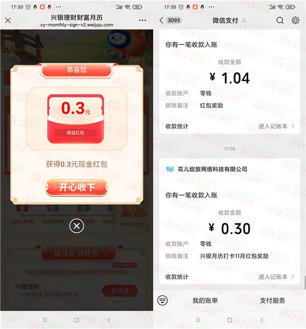 兴银理财财富月历签到抽最高88元微信红包 亲测中0.3元秒推