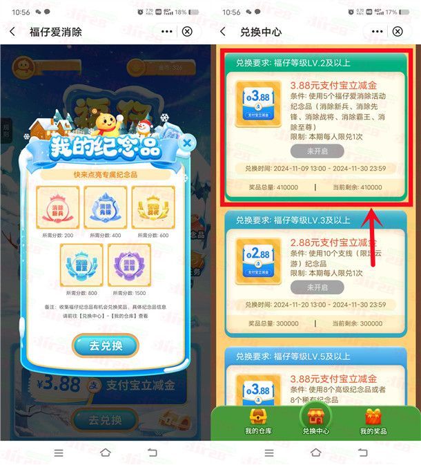 中国银行福仔爱消除的活动又来了,之前参加过兑换过的也可以去,现在是新一期,通过打开中国银行APP搜索【福仔云游记】进去福仔爱消除活动里,小游戏分数达到1500分就可以获得5个纪念品,可以在11月9日用这5个纪念品兑换3.88元支付宝红包,一共有41万份3.88元支付宝红包。