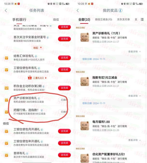 工行资产诊断抽微信立减金的活动又来了,跟以往一样这个活动需要28岁以下才有活动入口,如果超过28岁是没有入口的,通过打开中国工商银行APP进去【任务中心】页面,点击【资产诊断体验有礼】任务,完成简单的诊断任务抽奖,还有一个浏览任务也可以一起抽1次,非必中。