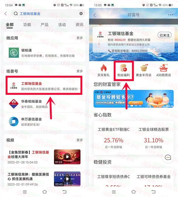 小编提示:打开“中国工商银行”APP搜索【工银瑞信基金】下拉页面点场景号进去,点【粉丝福利】再点第一个【基金投顾知多少】进去完成3个简单的任务可以抽奖2次,刚中2个1元微信立减金