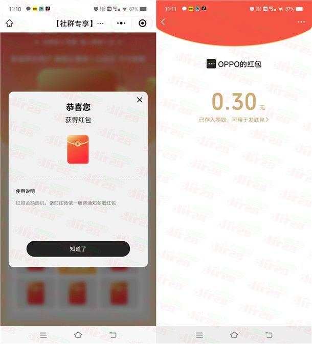 参加oppo举办的进OPPO群领现金红包活动,通过打开微信进去小程序活动里,进去按照提示添加oppo企业微信群(如果满了就换个门店加),添加后点击微信群的链接进去抽奖,可以中到一个随机金额的微信红包,小编测试中到0.3元红包秒推。