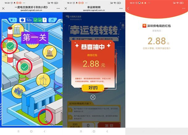参加南网在线举办的寻找小荷低碳节能小游戏抽红包活动,通过打开微信进去活动里,这个活动目前有点卡,每天可以点击【游戏次数】进去领取1次游戏机会,小游戏在规定时间内找到3个“电小荷”就可以抽奖1次(别乱点,点错会扣时间),有机会中到2.88-188元微信红包,小编测试中到2.88元红包秒推,非必中。