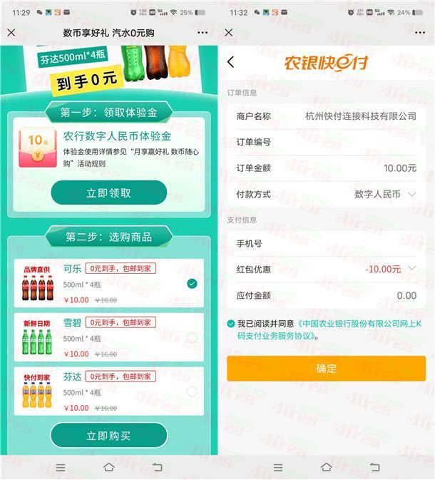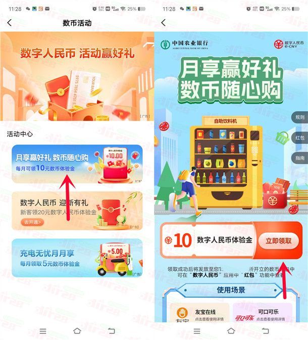 参加农行举办的月享赢好礼数币随心购活动,通过打开打开“中国农业银行”APP搜索【数字人民币】进去,点【热门活动】再点【月享赢好礼数币随心购】进去可以直接领到10元数字人民币红包,然后再进去第2个活动里,买4瓶可乐或者饮料,用农行数字人民币付款,就是0元。