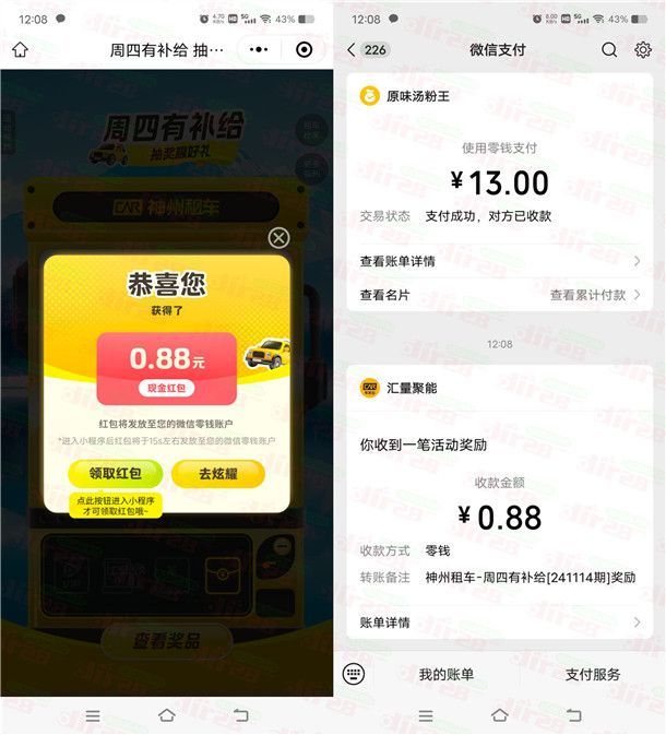 参加神州车友会举办的周四有补给抽奖赢好礼活动,通过打开微信进去小程序活动里,这个活动每周四都可以抽奖1次,有机会中到0.18-88.8元微信红包,小编测试中到0.88元,中到红包需要按照提示点击进去小程序里再返回来就会推送,非必中。