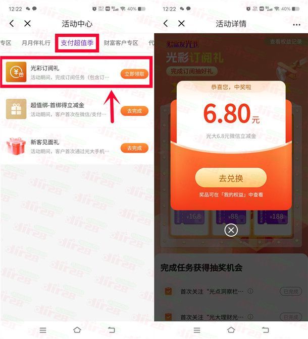 小编提示:注册过光大银行二类电子卡的都可以去,打开“光大银行”APP,在【我的】页面点【权益服务】进去,在【我的活动】那里点更多进去,顶部选择【支付超值季】进去点【光彩订阅礼】参加,完成几个关注任务可以抽奖1次(如果之前关注过就取消重新关注就行),刚中6.8元