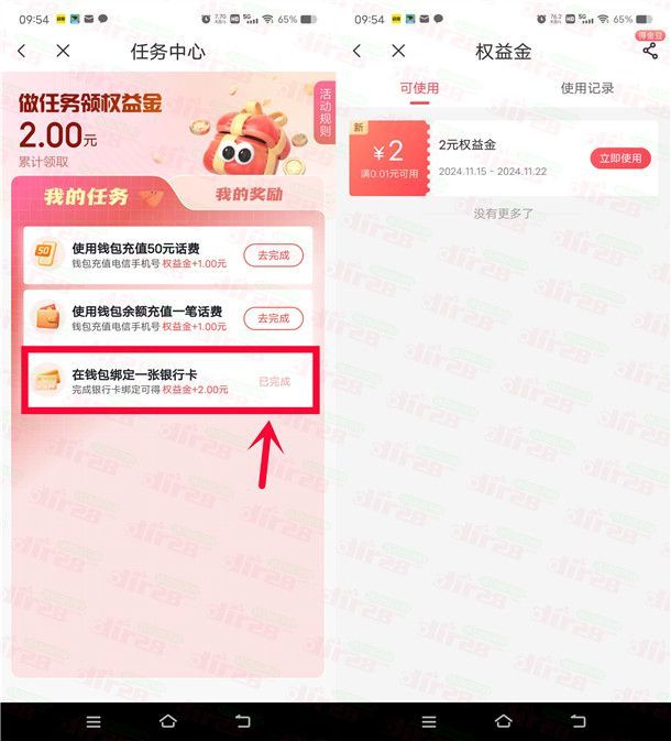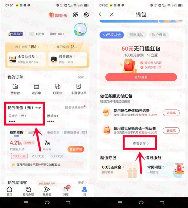 小编提示:打开“中国电信”APP,在【我】页面点【我的钱包】进去,下拉页面到底在做任务赚支付红包那里点【查看更多】进去,完成绑定一张银行卡的任务就可以领到2元权益金红包(如果要绑的卡已经绑定了也可以先解绑再去绑定),2元权益金红包可以用“中国电信”APP扫自己的个人微信收款码变现