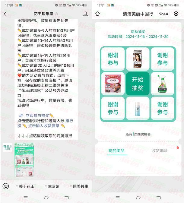 小编提示:微信扫描下面二维码关注【花王理想家】回复【清洁美丽中国行】参加,点击推送的链接进去可以抽奖1次,邀请好友助力也可以领取实物