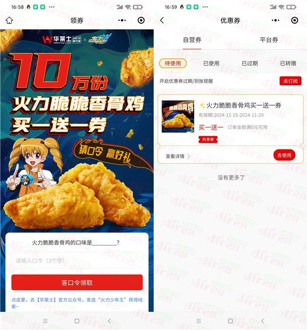 华莱士小程序填口令领脆脆香骨鸡买一送一券 限量10万份