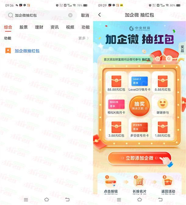 小编提示:打开“中金财富”APP搜索【加企微抽红包】进去跳转到微信小程序里,按照提示添加企业微信就可以抽奖1次