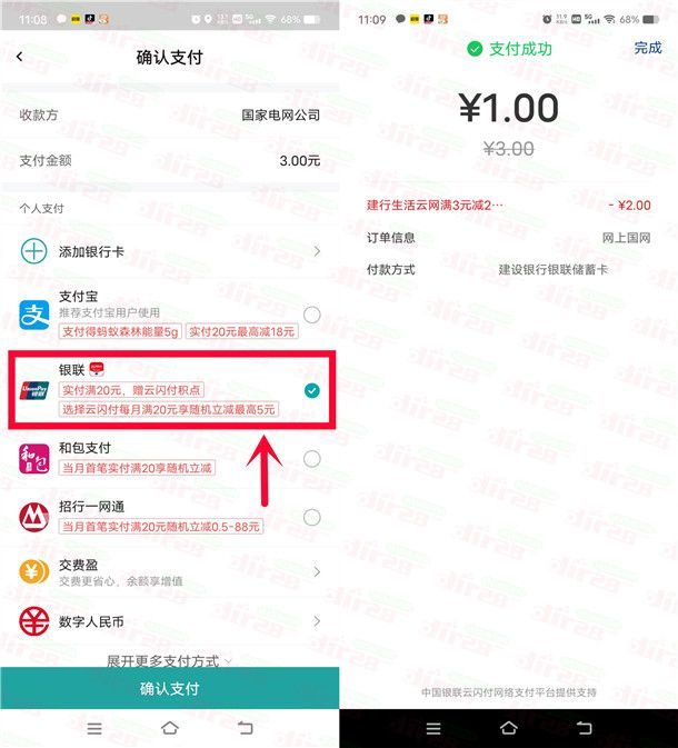 小编提示:打开“中国移动”APP自定义金额充3元话费、或者打开“网上国网”APP充3元电费,支付方式选择【银联】进去再选择【建行生活】会立减2元,等于1元充值3元话费或者电费,如果支付的时候没有显示立减2元就不要付