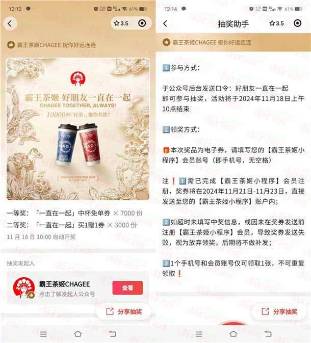 参加霸王茶姬举办的“好朋友一起在一起”微信小程序抽中杯免单券活动,通过打开微信进去小程序活动里,进去直接抽就行,在11月18日上午10点开奖,随机送出7000份中杯奶茶免单券、和3000份买1送1券。另外再预告一个活动,11月17日-23日霸王茶姬猜口令每天再送10万份奶茶免单。