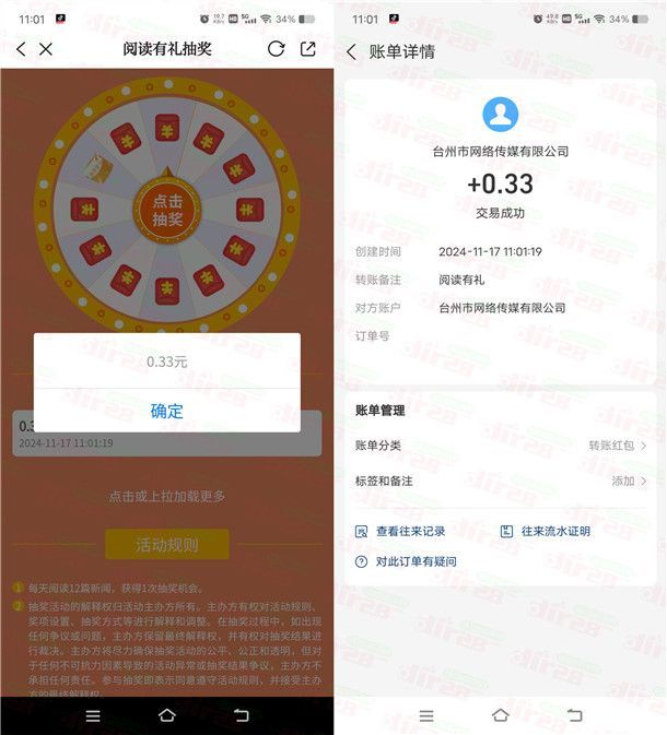 参加望潮举办的阅读有礼抽现金红包活动,通过下载打开“望潮”APP进去阅读有礼活动里,每天浏览12篇文章可以抽奖1次(点进去再返回就行),有机会中到0.3-100元现金红包,小编测试中到0.33元秒到支付宝余额里,每天都可以去抽1次,可以中多次,非必中。