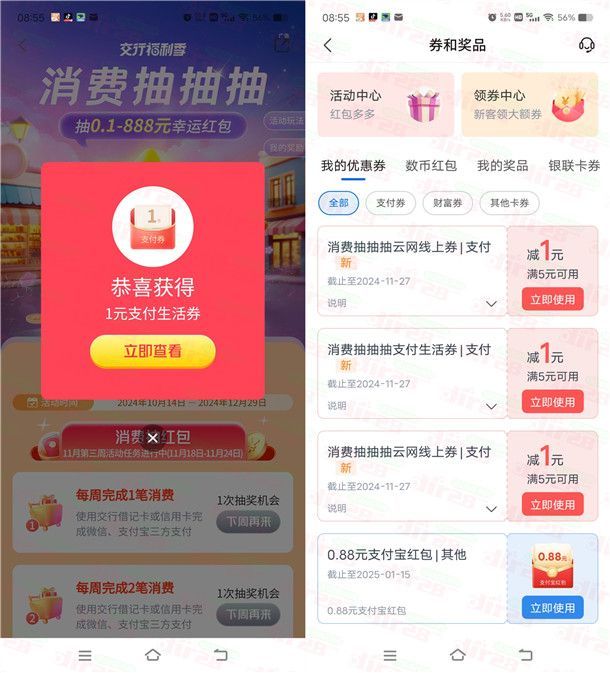 交通银行消费抽抽抽活动抽最高888元支付券红包 亲测中3元