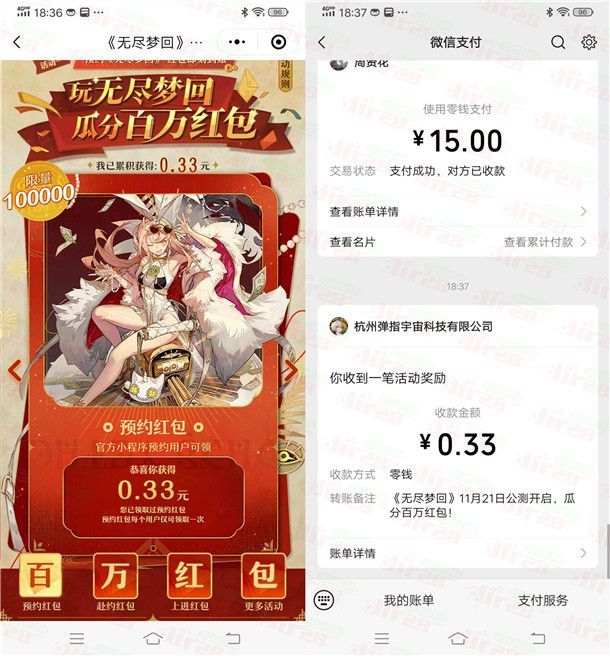 参加无尽梦回举办的微信小程序瓜分百万红包活动,通过打开微信进去小程序活动里,进去首次预约可以领到一个0.3-188元随机不等的微信红包(限量10万份,如果之前预约过就领不了),分享好友助力也可以领红包,除了预约红包是直接推送的,其他红包需要在11月21日手游上线后领取,数量限量。