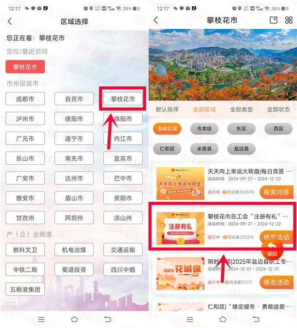 小编提示:下载打开“川工之家”APP注册(注册地手动选择为:攀枝花市),再点底部频道选择【攀枝花市】点【线上活动】再点【工会活动】进去,点注册有礼进去抽,刚中3.6元