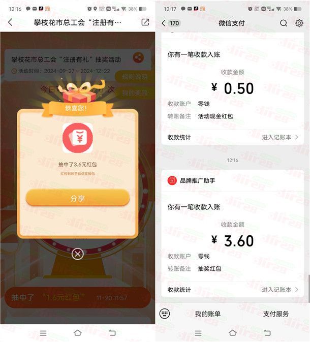 参加川工之家举办的攀枝花频道注册有礼抽红包活动,通过下载打开“川工之家”APP注册(注册地手动选择为:攀枝花市),再点底部频道选择【攀枝花市】点【线上活动】再点【工会活动】进去,点注册有礼进去抽奖,有机会中到1.6-3.6元微信红包,小编测试中到3.6元红包秒推。