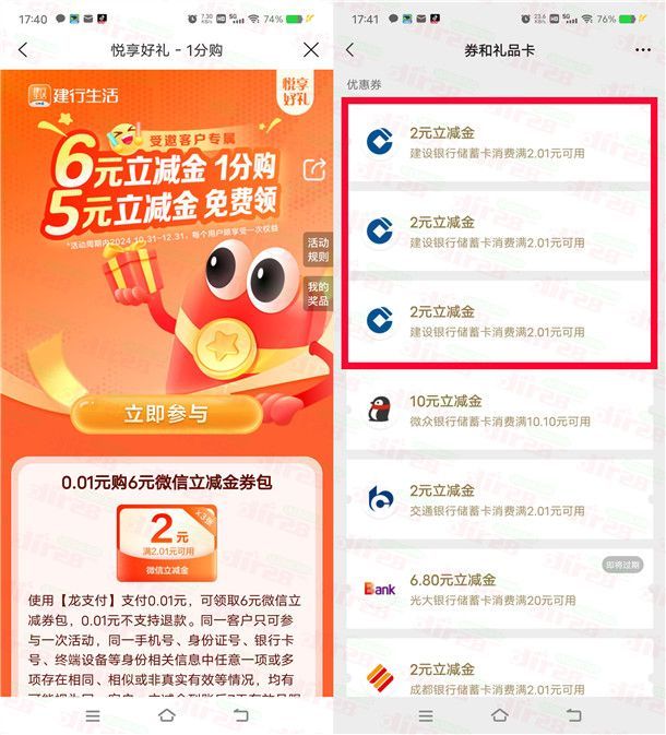 小编提示:这个活动现在全国很多地区都陆续开放了可以领取,手机扫码跳转到“建行生活”APP活动里,报名后支付0.01元可以领取3张2元微信立减金