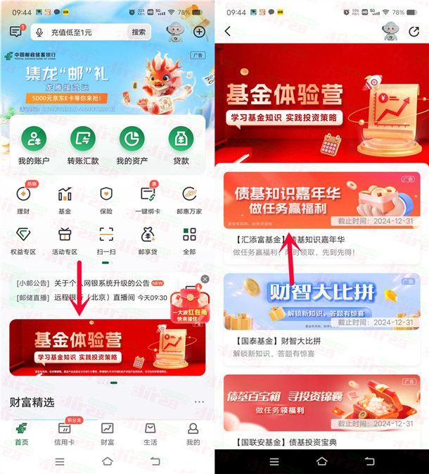 小编提示:打开“邮储银行”APP,首页点中间滚动横幅【基金体验营】点【债基知识嘉年华做任务赢福利】进去,完成3个简单的浏览任务领1.68元现金红包,可以直接提到银行卡