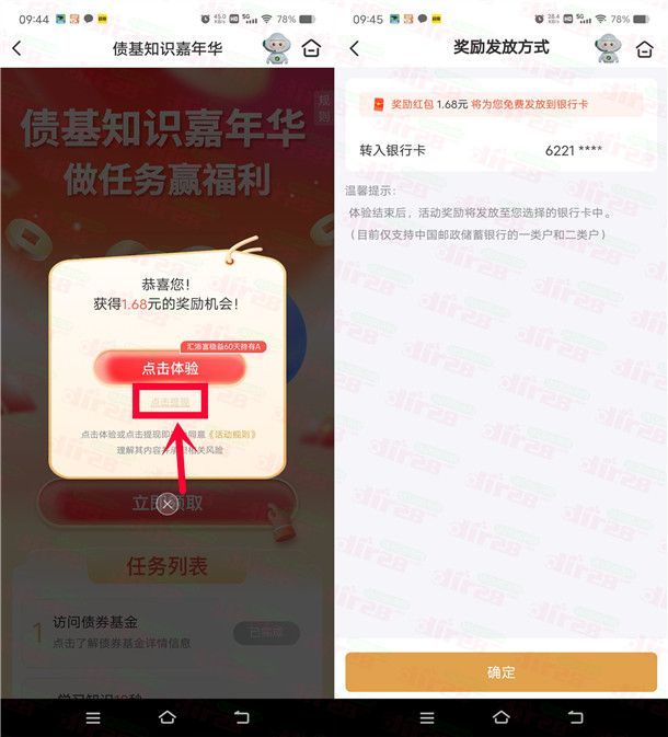 参加邮储银行举办的基金体验营债基知识嘉年华活动,通过打开“邮储银行”APP,首页点中间滚动横幅【基金体验营】点【债基知识嘉年华做任务赢福利】进去,完成3个简单的浏览任务可以领到1.68元现金红包,得到的现金红包可以直接提现到银行卡。