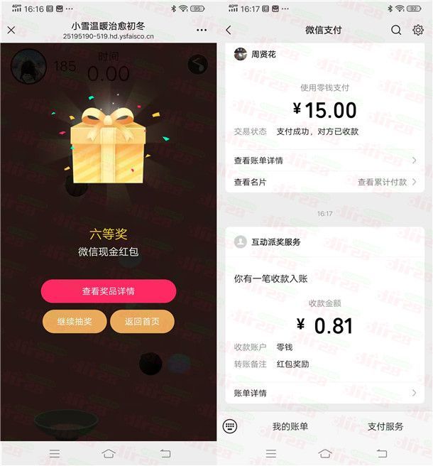 参加横琴人寿举办的冬天补冬大作战游戏抽红包活动,通过打开微信进去活动里,只要在小游戏中分数达到80分就可以进行抽奖,有机会中到随机金额的微信红包、琴豆、或者实物,小编测试中到0.81元红包秒推,非必中。