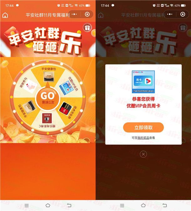 参加平安保险举办的平安社群砸砸乐活动,通过打开微信进去小程序活动里,完成1个简单的浏览任务就可以抽奖1次,有机会中到优酷会员周卡、50元电影券,小编测试刚中7天优酷会员(可以自用也可以出售卖给别人),中到健康包没用,非必中。