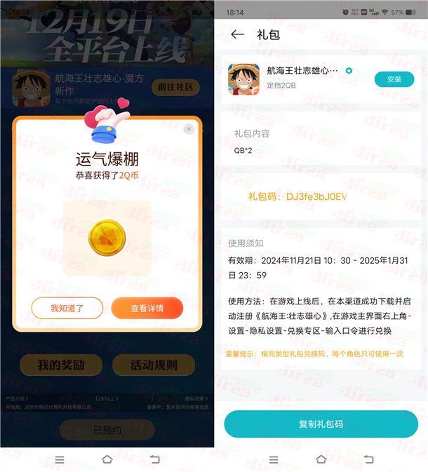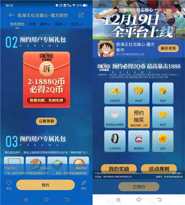 小米游戏中心预约航海王必中2-1888个Q币 需手游上线兑换