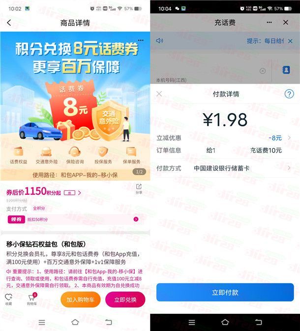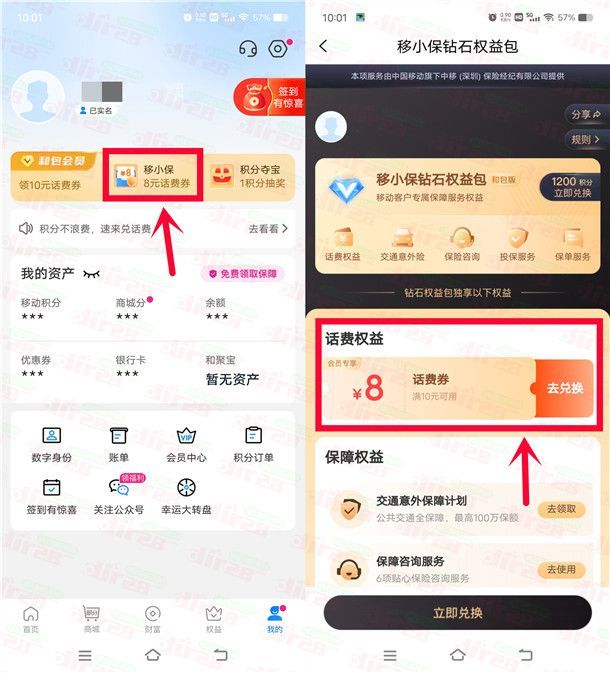 小编提示:打开“和包”APP,在【我的】页面点【移小保】进去,有1200个定向积分的可以直接兑换钻石权益包,兑换后会得到1张8元话费券,可以在和包APP里充值10元手机话费就可以使用(移动号可以自定义金额充值10元)