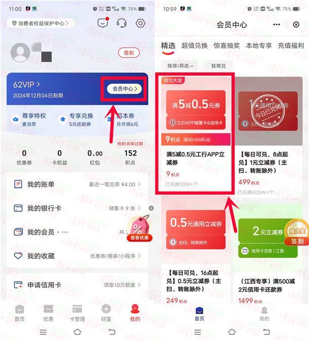 小编提示:打开“云闪付”APP,在【我的】页面点【会员中心】进去,下拉页面可以用9个积分兑换满5减0.5元工行APP立减券,每天可以兑换1次,每周可以兑换2次,每个人最多可以兑换10次