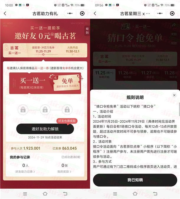 参加古茗举办的买一送一提前享邀友0元喝古茗活动,通过打开微信进去小程序活动里,邀请3个好友或者小号助力可以抽奖1次,有机会中到买一送一券、或者奶茶免单券,可以发起助力抽多次,中到的奶茶免单券可以在古茗0元喝奶茶,非必中。