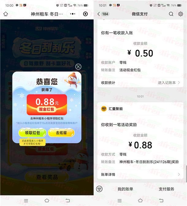 神州车友会冬日刮刮乐抽0.18-88.8元微信红包 亲测中0.88元