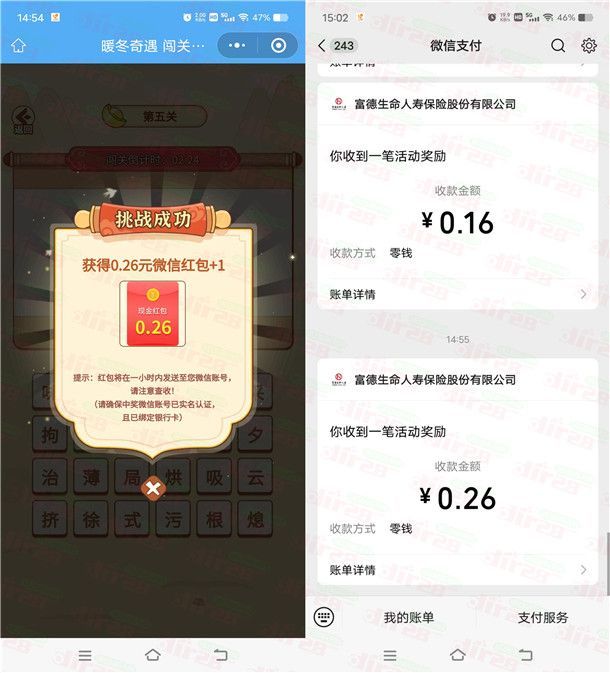 参加富德生命人寿举办的暖冬奇遇闯关赢好礼活动,通过打开微信进去小程序活动里,每天多次游戏机会,成语小游戏通关可以抽奖多次,每次都有机会中到随机金额的微信红包,这个活动可以中多次,有时候中1次会推送2个红包,小编测试中到2个0.16元+2个0.26元红包,非必中。