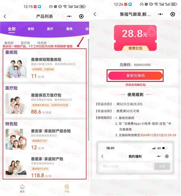 小编提示:复制下面文字到微信点开,点顶部滚动图“集专属徽章 解锁超百倍红包!”进去,完成“集徽章 拼手气”任务即可,完成任务1个工作日后可点亮4个徽章,领取28.8元缴费红包(针对云缴费的保险新客户),可以交水电费抵扣。