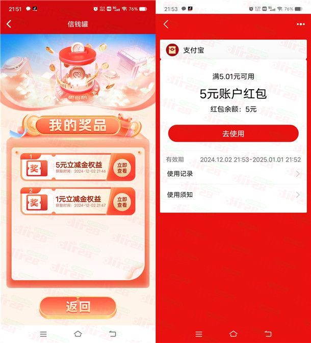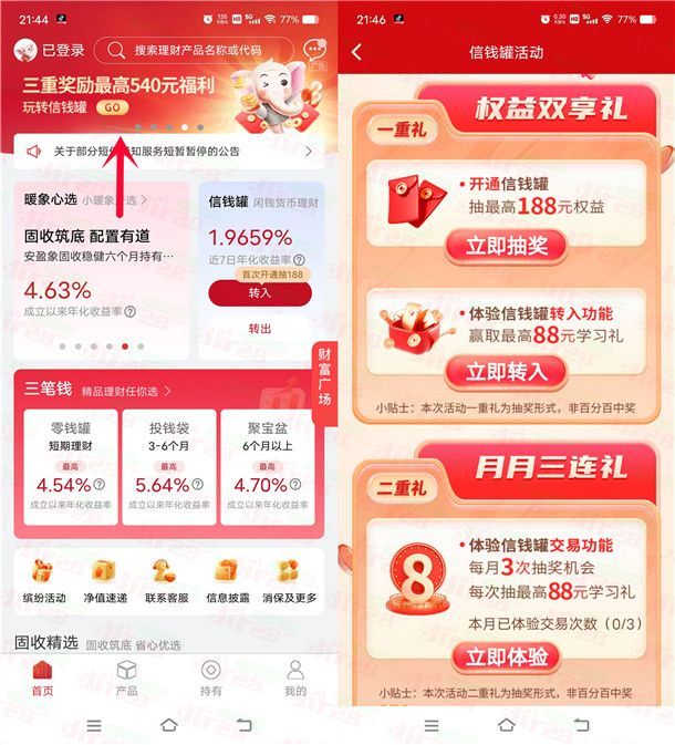 参加信银理财举办的信银罐三重奖励抽最高188元支付宝红包活动,注册过信银理财的老用户也可以去,通过打开信银理财APP进去信银罐活动里,开通可以抽最高188元支付宝红包、体验转入功能再抽最高88元支付宝红包,另外每个月还可以再抽最高88元,小编测试中到1元+5元支付宝红包秒到。