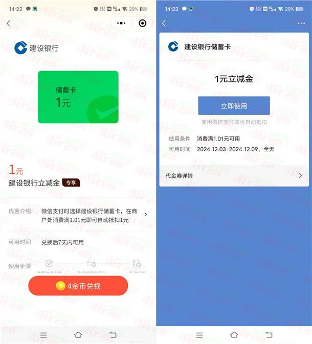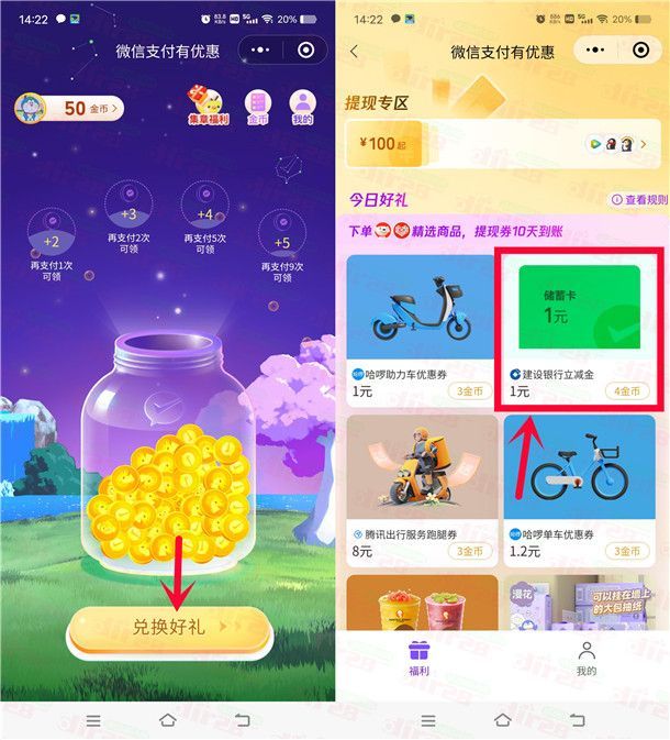 这个活动只有部分微信才有入口参加,通过打开微信进去【微信支付有优惠】小程序里,点底部【兑换好礼】进去,如果进去有显示1元建设银行立减金就可以用4个金币兑换,只有部分用户才有,如果没有金币的可以大小号相互赠送金币。
