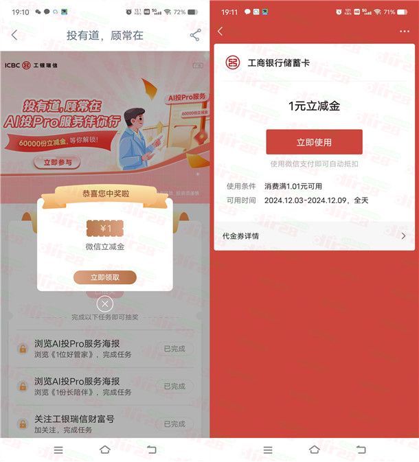 参加工银瑞信基金举办的AI投Pro服务伴你行抽6万份微信立减金活动,通过打开中国工商银行APP搜索【工银瑞信基金】进去场景号里,点【热门活动】进去,点第一个进去完成3个简单的浏览任务抽6万份微信立减金,小编测试刚中1元,下面还有3个抽现金红包的活动没有做过的也可以顺带一起抽。