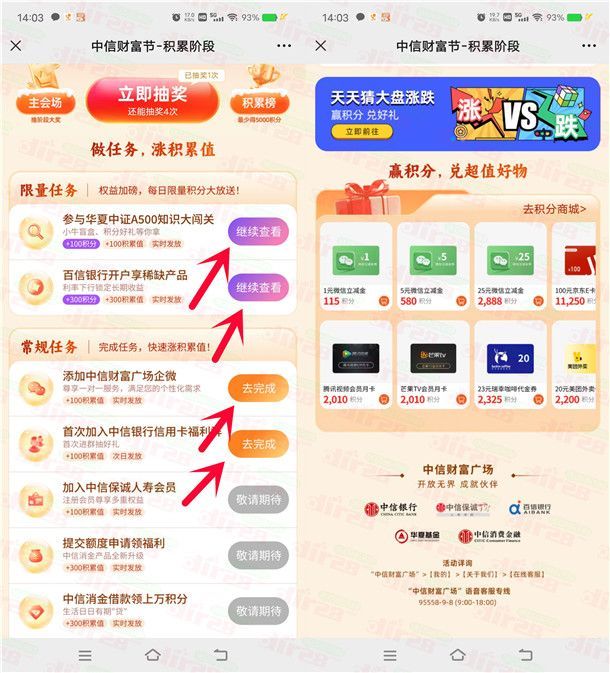 参加中信银行举办的中信财富节大积大利好礼相迎活动,通过打开微信或者中信银行APP进去活动里,进去登录后完成页面指定的任务可以领积分、和积累值,积累值也可以抽积分,累积得到的积分可以在积分商城里兑换1-100元微信立减金、京东卡、实物,小编测试兑换了50元微信立减金秒到。
